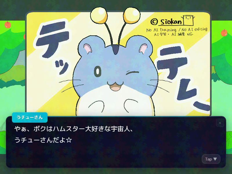 ハムスターが大好きな宇宙人「うチューさん」と会話する、短編ノベル。